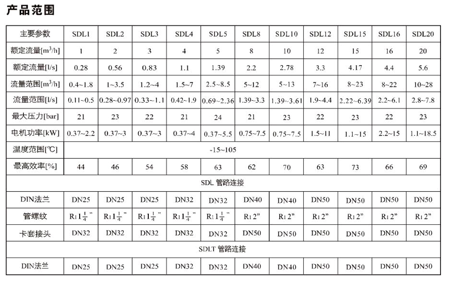 SDL16/SDLT16是一種多功能產(chǎn)品,可以輸送從自來水到工業(yè)液體的各種不同介質(zhì),適用于不同溫度、流量和壓力范圍。
